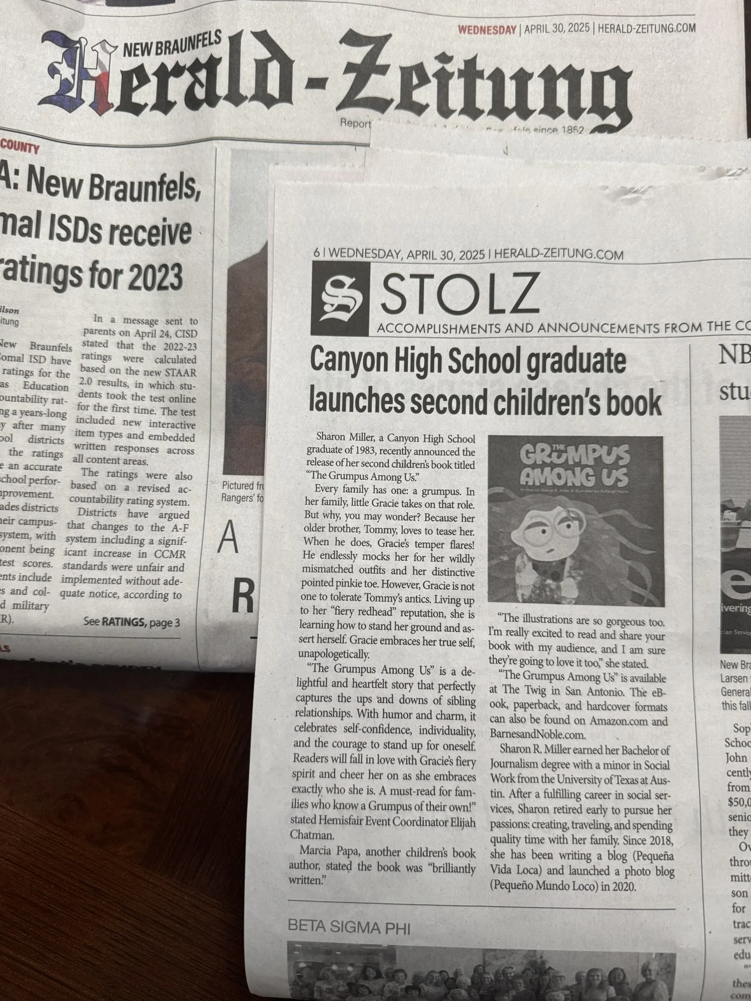 Sharon’s hometown newspaper featured the release of Sharon’s second book, “The Grumpus Among Us”, on April 30, 2025.
